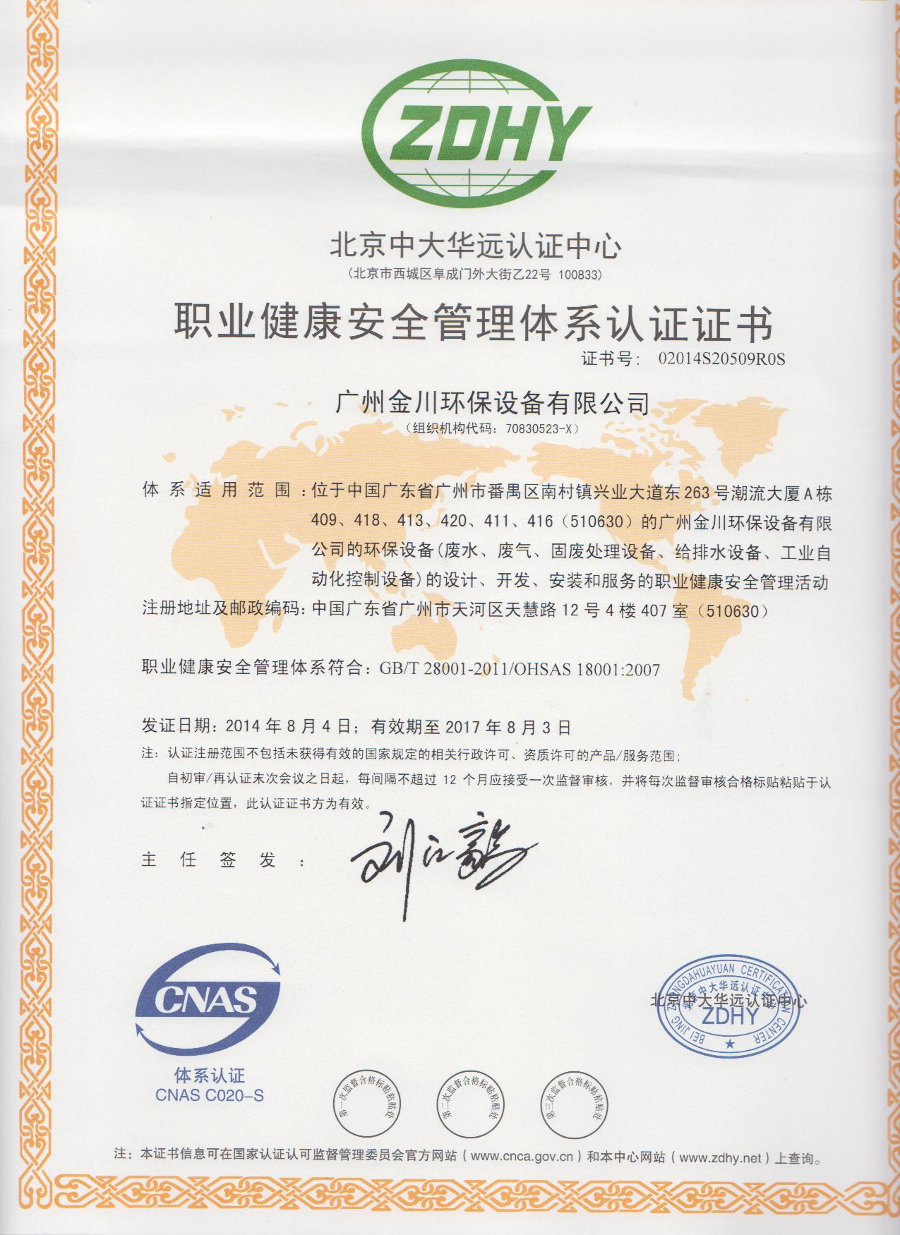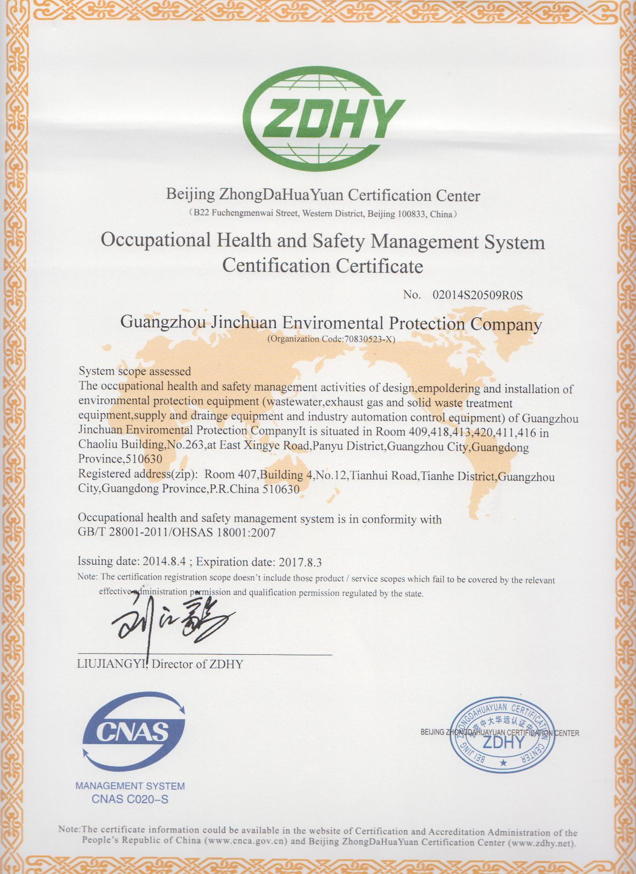 從2013年開始,公司開始著手認證的準備,經過多次修訂和完善,最終在全體員工的共同努力下,經過北京中大華遠認證中心的認證審核,于2014年8月4日正式通過國家標準審核,并取得了職業健康安全管理體系兩項證書。